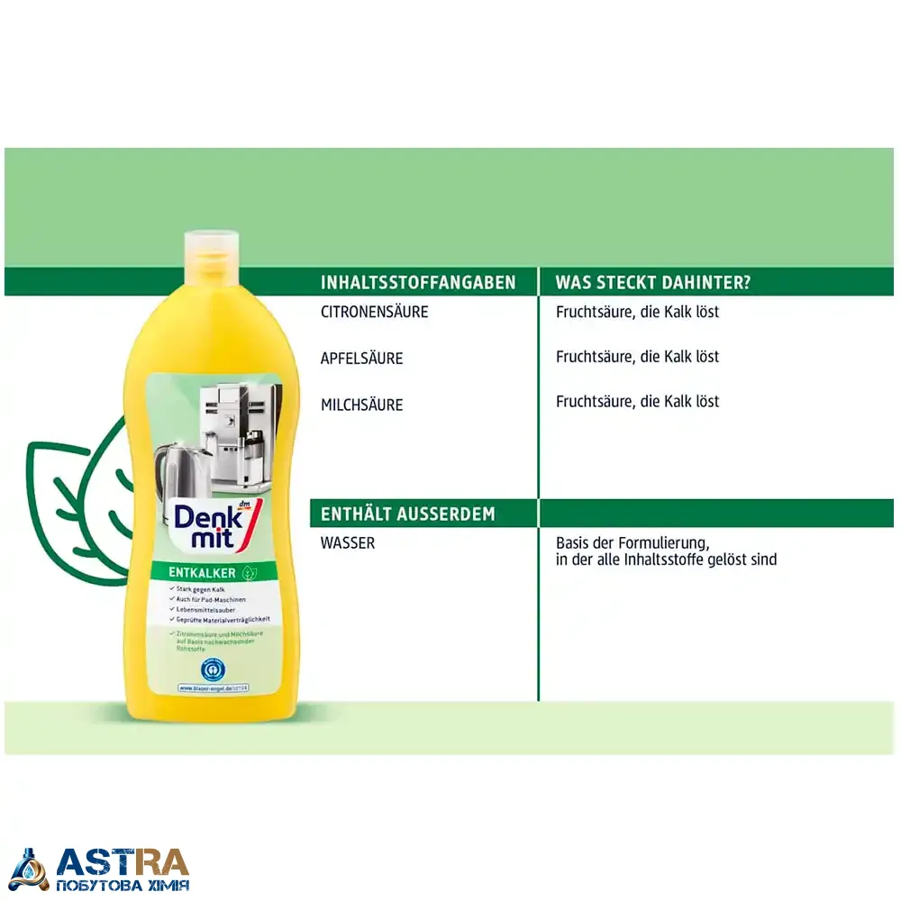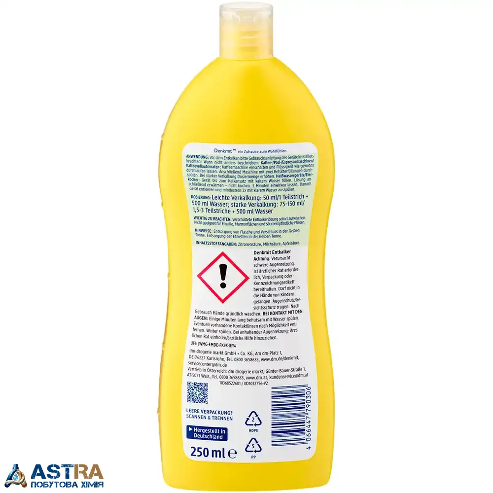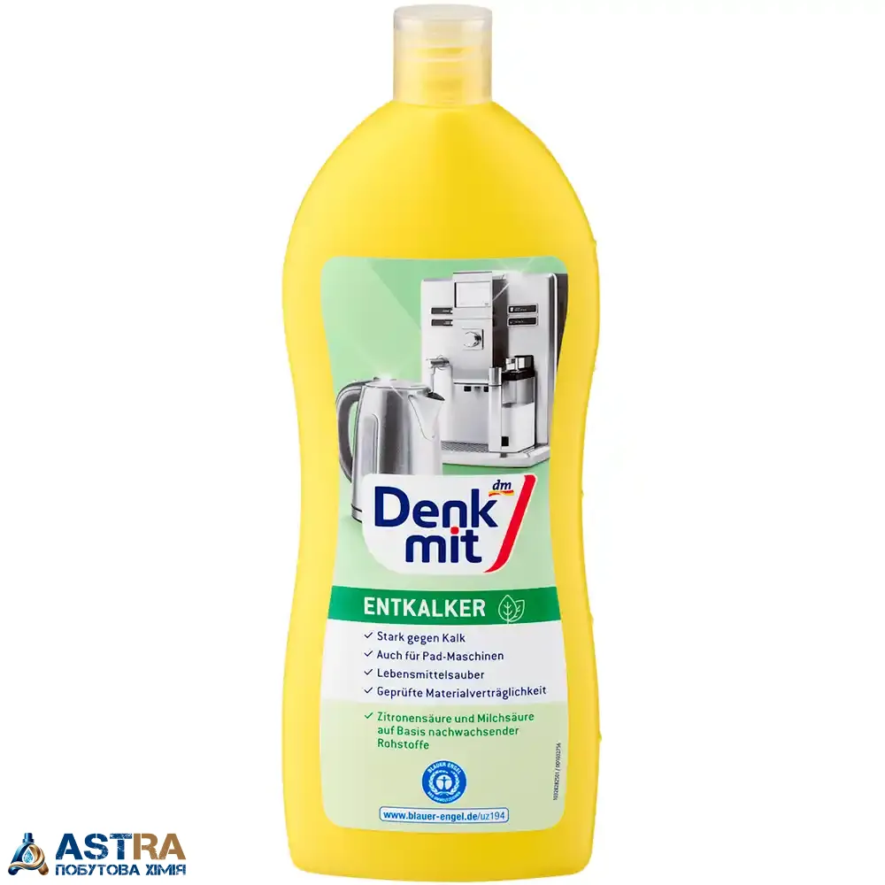 Купити засіб для видалення накипу Denkmit Entkalker, 250 мл ви можете в нашому інтернет-магазині ASTRA. Ми пропонуємо тільки оригінальну продукцію (Німеччина) та забезпечуємо швидку доставку Новою Поштою з Дніпра по всій Україні. Обирайте Denkmit — продовжуйте життя вашій техніці та насолоджуйтесь ідеальною кавою.