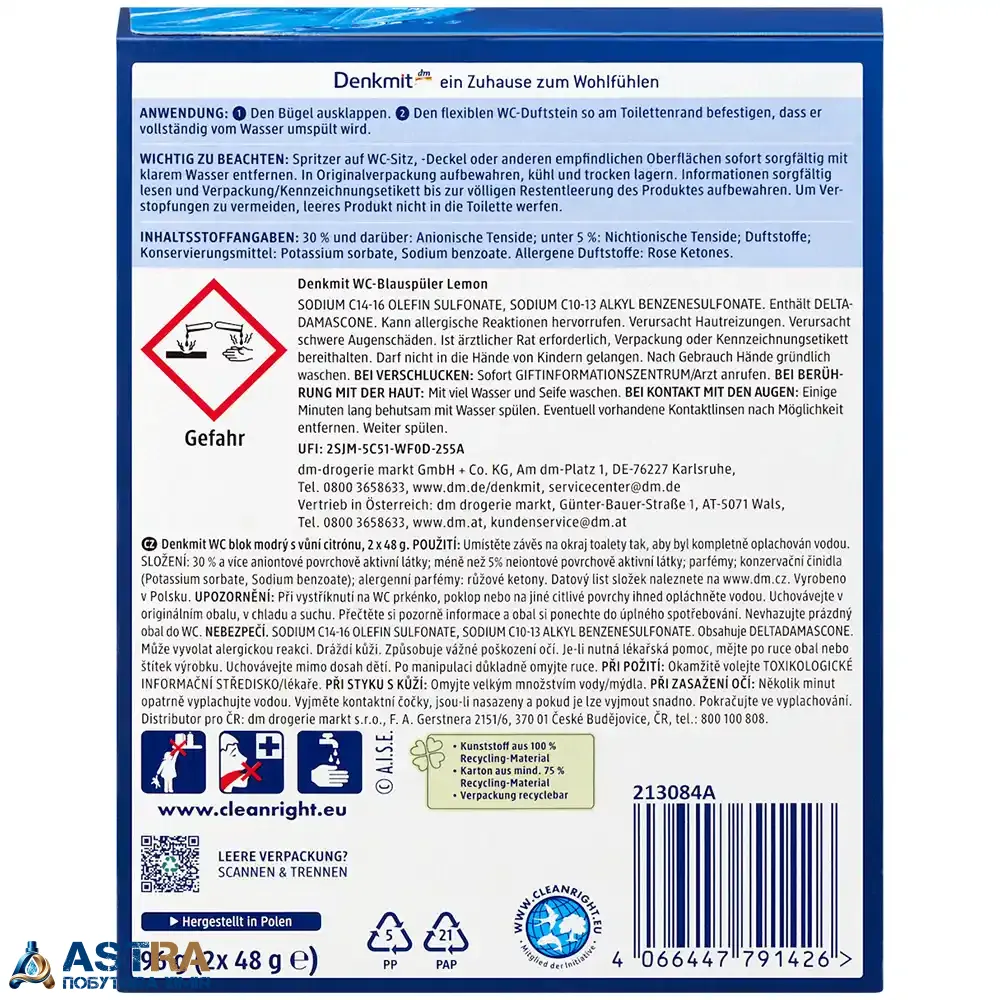 Denkmit Lemon 5-fach Power (Ефект синьої води та професійне очищення з Німеччини) — це комплексний засіб для тих, хто цінує максимальну гігієну та естетичний вигляд сантехніки. Спеціальна комбінація активних інгредієнтів працює у п'яти напрямках, забезпечуючи чистоту без зайвих зусиль.