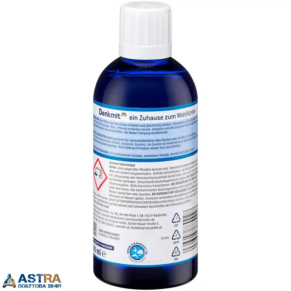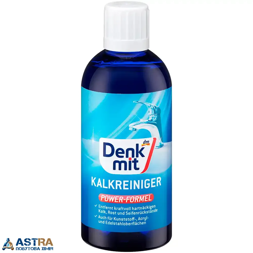 Купити засіб для чищення вапняного нальоту Denkmit Kalkreiniger Power-Formel, 500 мл ви можете в інтернет-магазині ASTRA. Ми пропонуємо тільки оригінальну продукцію (виробництво Німеччина) та забезпечуємо швидку доставку по всій Україні. Обирайте Denkmit - німецьку якість для бездоганної чистоти вашого дому.