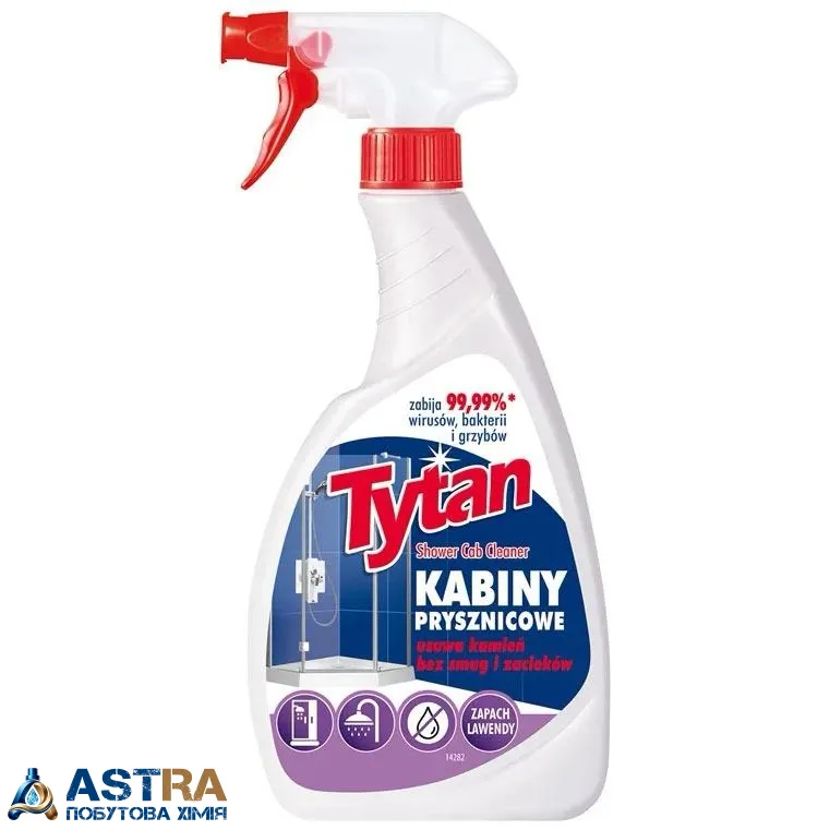 Tytan Kabiny Prysznicowe — спрей для чищення душових кабін, який ефективно видаляє вапняний наліт, мильні залишки та водяні плями. Завдяки спеціальній формулі він також має дезінфікуючий ефект і створює захисний шар, що запобігає повторному утворенню нальоту.
