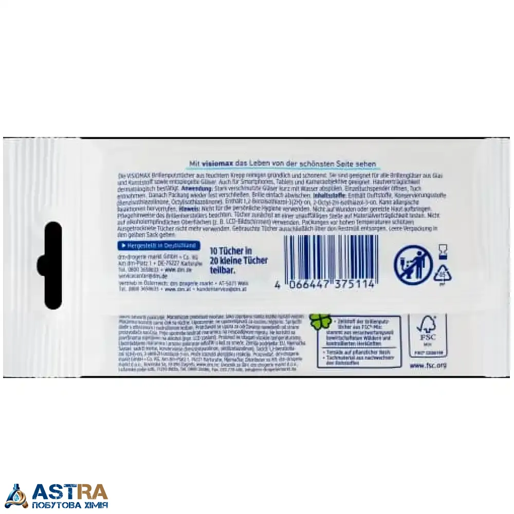 Купити серветки для чищення окулярів Visiomax, 10 шт ви можете в нашому інтернет-магазині ASTRA. Ми пропонуємо тільки оригінальну продукцію (Німеччина) та забезпечуємо швидку доставку Новою Поштою з Дніпра по всій Україні. Обирайте Visiomax — чисті окуляри без зайвих зусиль.